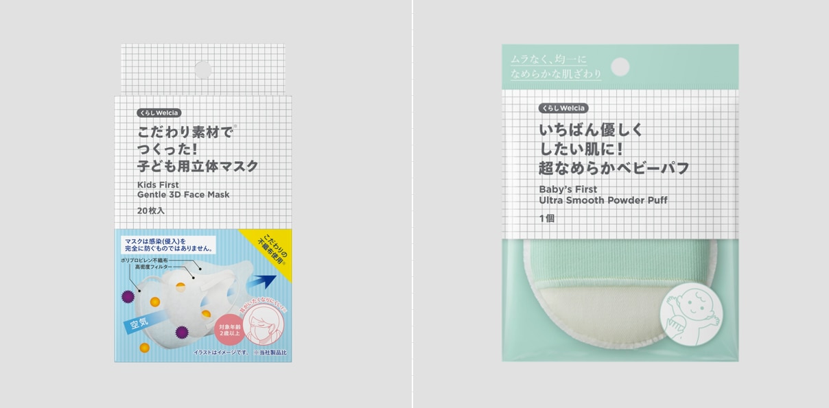 「こだわり素材でつくった!子ども用立体マスク」、子供の小さなお顔にしっかりフィットする立体構造の専用マスクを、高品質でありながら、手頃な価格で提供したいという思いから誕生しました。本商品は子どもの顔に合わせた小さめサイズ設計で、着用時に隙間ができにくい点が特徴。口元に触れる内側には、おむつにも使用される柔らかさの不織布を使用し、通気性のよいマスクに仕上がっています。耳ひもは伸縮性に優れた幅6mmの耳ひもを使用、長時間着用しても耳が痛くなりにくい快適な着け心地。また、三層構造の高密度不織布フィルターが、ウイルス飛まつや花粉をしっかりブロック。感染症が増えるこれからの季節はもちろん、花粉やPM2.5対策にも効果的で、オールシーズンで使用できます。「いちばん優しくしたい肌に!超なめらかベビーパフ」、赤ちゃんのデリケートな肌に優しく、パウダーを均一に馴染ませたいという声に応えて開発されました。赤ちゃんを爪で傷つけないようグローブ型で守り、また、毛先の長さにもこだわり、さらに長さを均一に揃えることでなめらかな肌触りとパウダーの塗り心地を実現しました。赤ちゃんや子供への使用だけでなく、ファンデーションなども快適に使用できます。