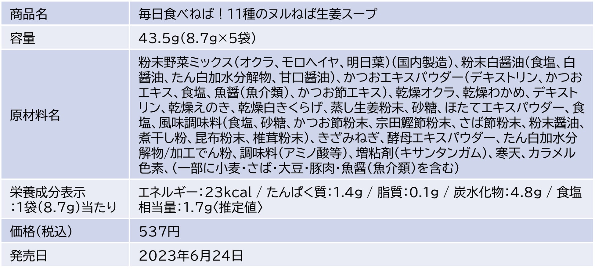 ウエルシア薬局株式会社(本社:東京都千代田区、代表取締役社長:田中 純一、以下ウエルシア)は、プライベートブランド(以下PB)「からだWelcia・くらしWelcia」より、「毎日食べねば!11種のヌルねば生姜スープ」を、2023年6月24日より全国のウエルシア薬局にて発売をします。4月に発売した「毎日食べねば!料理に足そうヌルねばの具」に続く、横浜薬科大学 総合健康メディカルセンターが監修する“ヌルねばシリーズ”の第二弾商品です。