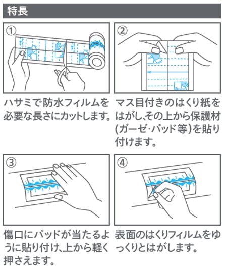 防水性のフィルムなので貼ったまま、入浴やシャワー、水仕事ができます。伸縮性に優れ、ひじやひざなどにもぴったりフィットします。通気性に優れ、むれにくい特殊防水フィルムを使用しています。傷の大きさに合わせて切って使用できるので、無駄なく経済的です。