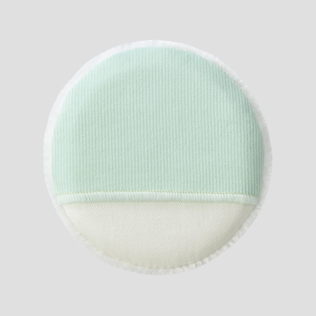 極細ポリエステル糸を使用し、肌触りがなめらかなベビーパフです。毛先2mmの長さで粉含みがよく、パウダーを均一に塗ることができます。赤ちゃんをツメで傷つけないグローブ型です。